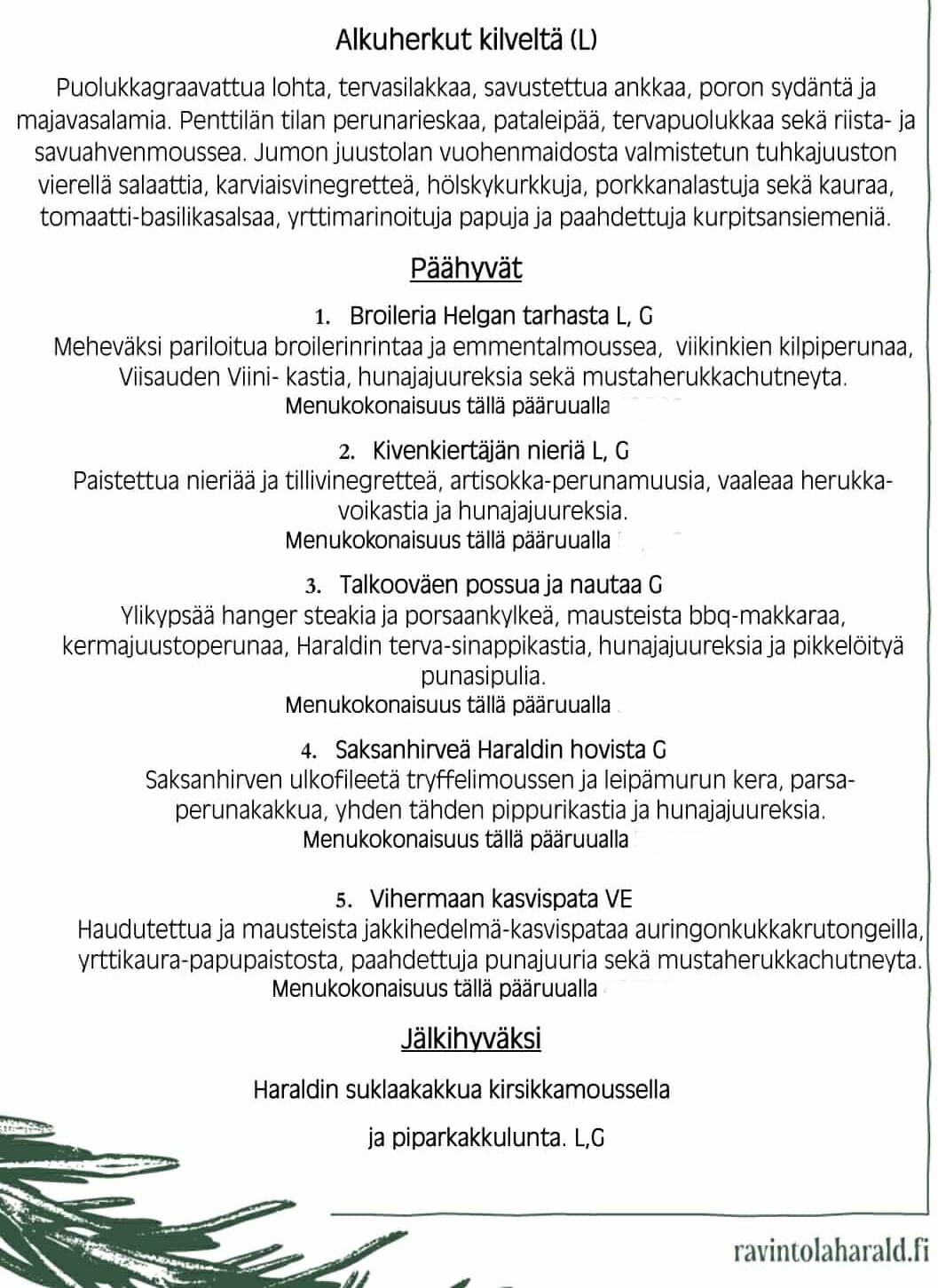 Siirrymme kulman taakse Viikinkiravintola Haraldsiin. Ruokahalumme nostattaa apertiivi (holiton tai hollinen valintasi mukaan) ja nauttimme ravintolan Pikkujoulu menuusta missä alkupalat noutopöydästä "kilveltä", pääruoka "päähyvät" valintasi mukaan sekä "jälkihyväksi" jälkiruoka. Ruokajuoma valintasi mukaan, virvoitusjuoma, lasi viiniä tai olut.